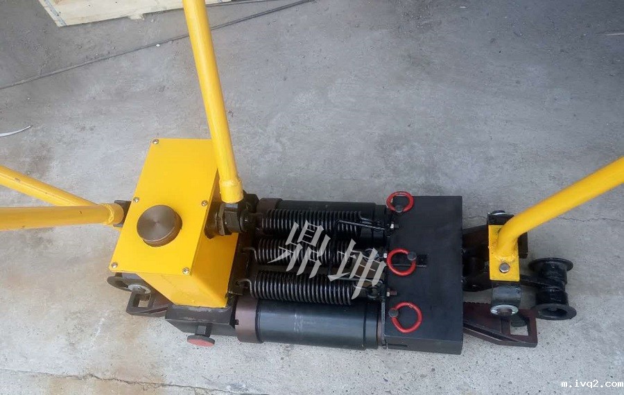 ㈠基本结构:主要由行走轮、斜铁、夹具体、安全销、复位弹簧、安全下道装置、油箱、油缸、油泵、溢流阀、回油阀等部分组成。