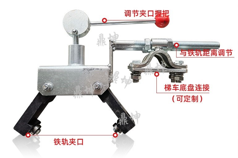 铁路接触网梯车防倾抓轨器,每台梯车配置为两个,相对于轨道对称安装于梯车两侧,可以防止梯车的倾覆。其上抱箍抱紧纵梁、主体放置距轨面至合适位置后扮动手柄旋转180°,使双钩(尼龙)抱紧铁轨。如有抱不紧或手柄不到位的现象则调整主体上方的滚花螺母即可。梯车防倾器与梯车连接处采用双重固定,使梯车更稳固。